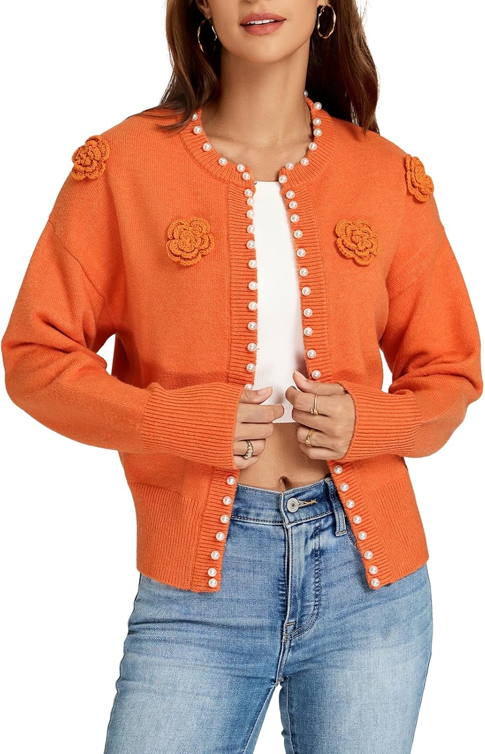 Women's Pearls Open Front Cardigan Sweater Casual Knitted Long Sleeve Floral Embroidered Outerwear Coat