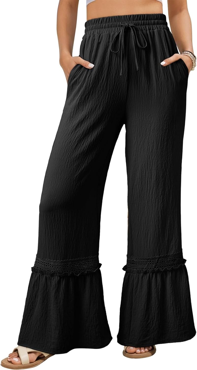 Dokotoo Women's Pants Casual High Waisted Wide Leg Pants Woman Loose Drawstrings Lace Trousers with Pockets