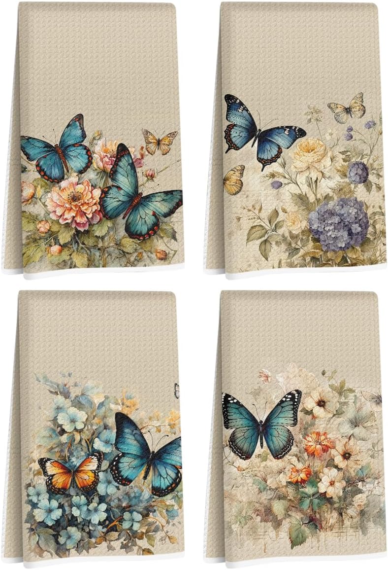 4 Pcs Vintage Butterfly Kitchen Towels, Watercolor Floral Decorative Absorbent Microfiber Dish Cloth Tea Towel, Artistic Waffle Soft Hand Towels for Farmhouse Home Bathroom, Butterfly Gifts