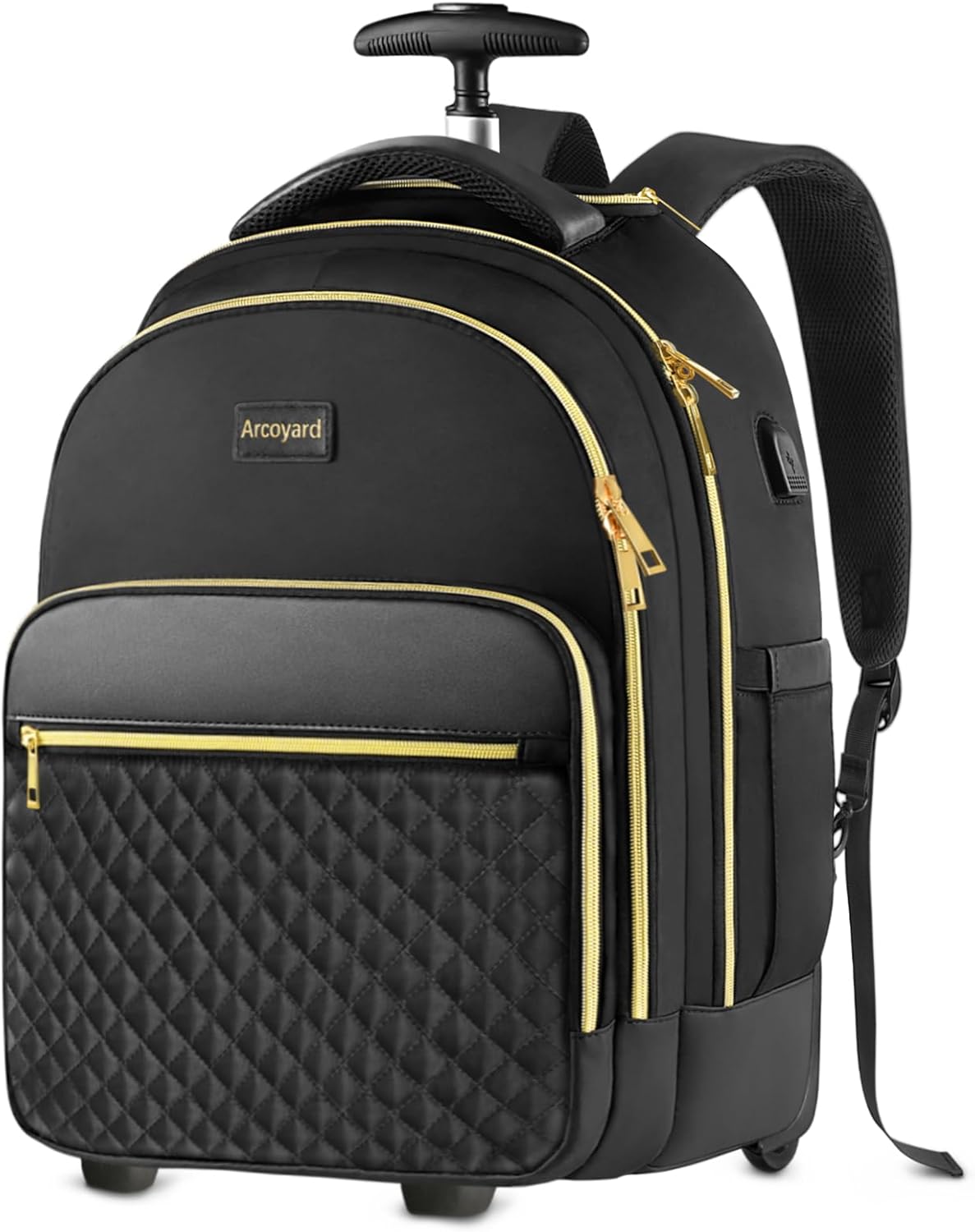 Rolling Backpack for Women, 15 inch Lightweight Wheeled Roller Laptop Backpack for Adults, Water Resistant Underseat Carry On Luggage Bag, TSA Friendly Anti Theft Business Gear, Black Gold