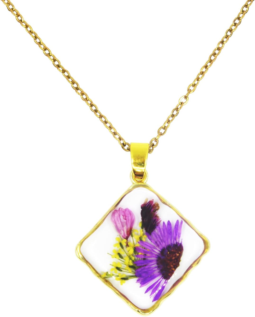 KBFORU Birth Flower Necklaces For Women - Month Flower Necklace - Handmade Pressed Flower Necklace - Unique Holiday Gift - Square Necklace Gold 18"