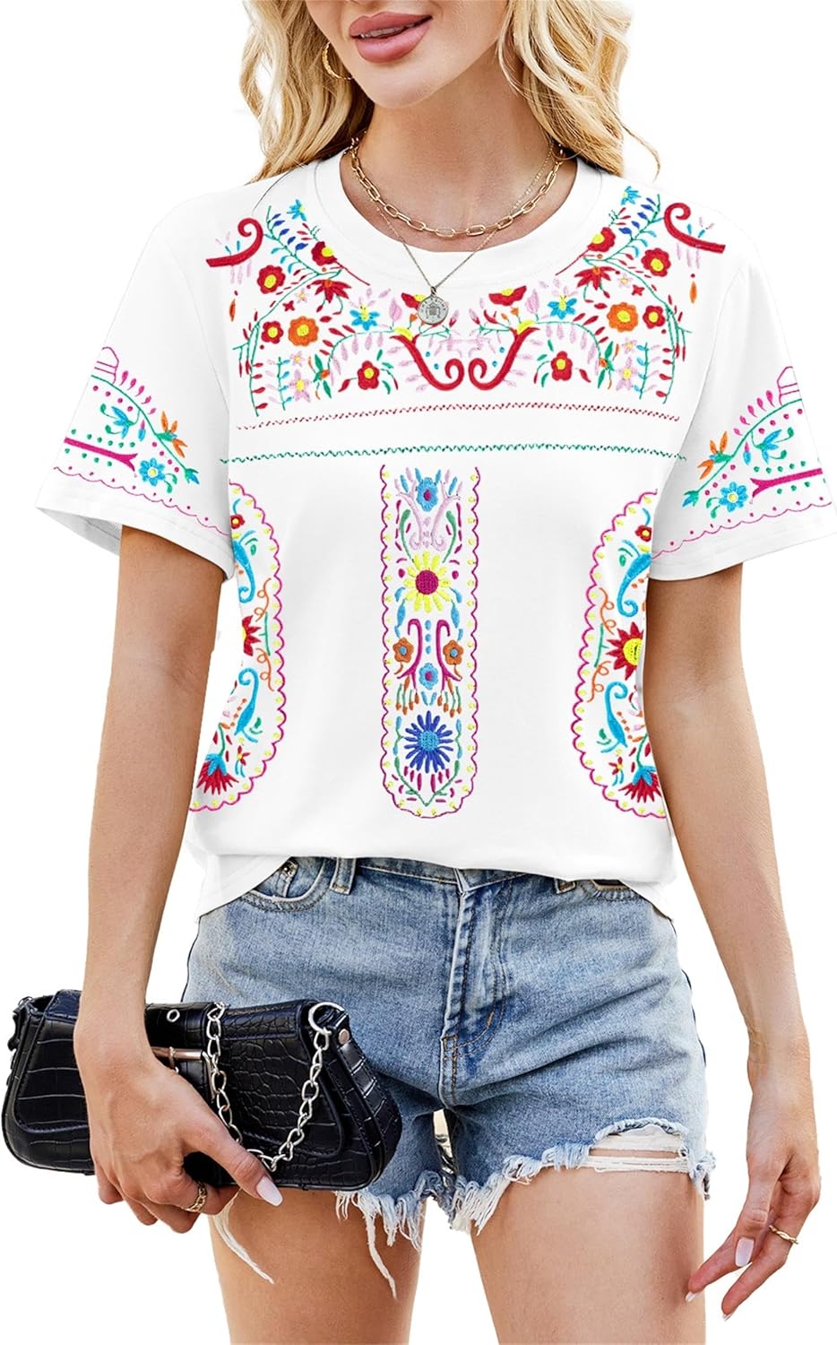 Embroidered Mexican Peasant Blouse Women Summer Boho Shirt Mexico Fiesta Short Sleeve Tops