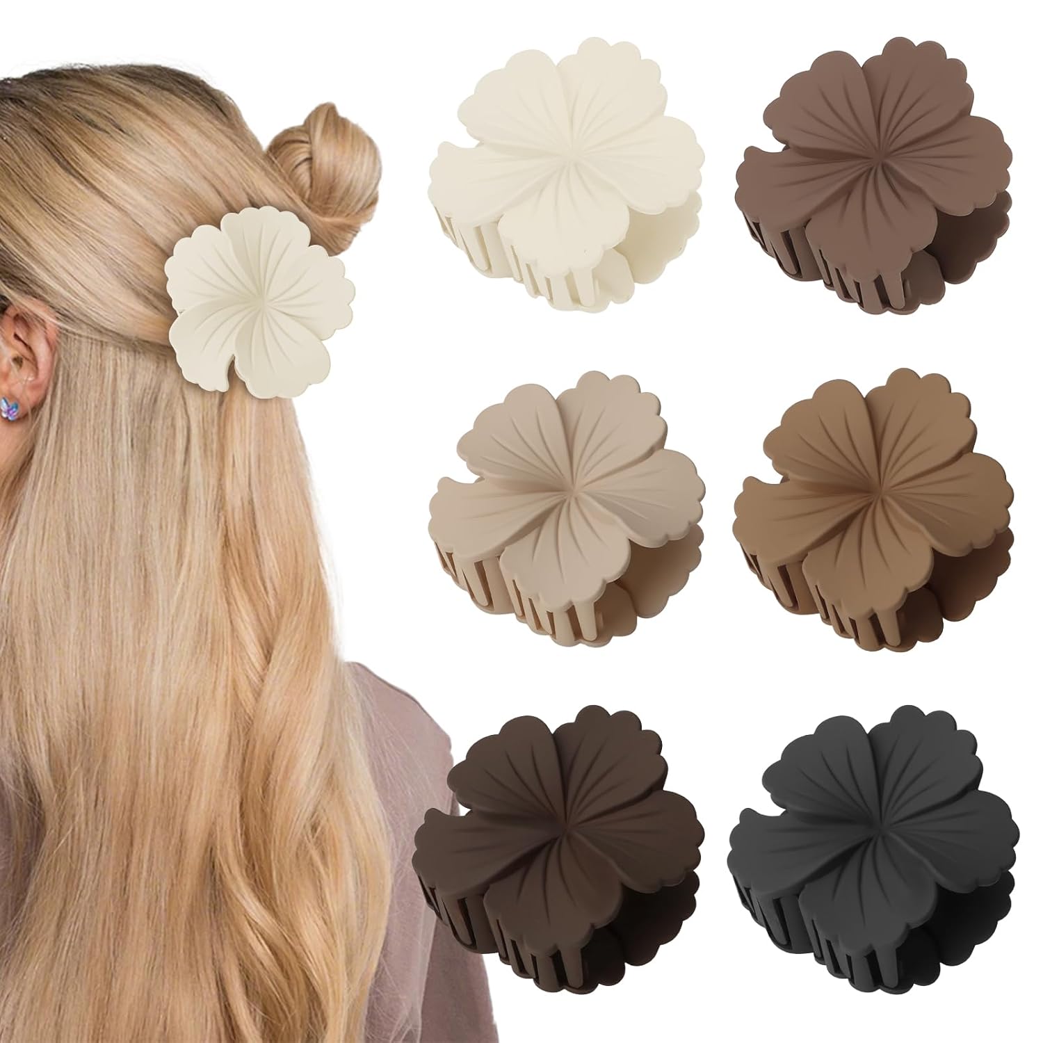 - 【FASHION FLOWER DESIGN】: Our hair claw clips are designed with a unique flower shape and there are 6 colors for you to choose. They can not only brighten up your everyday outfit, but also give you a hot and stylish summer style