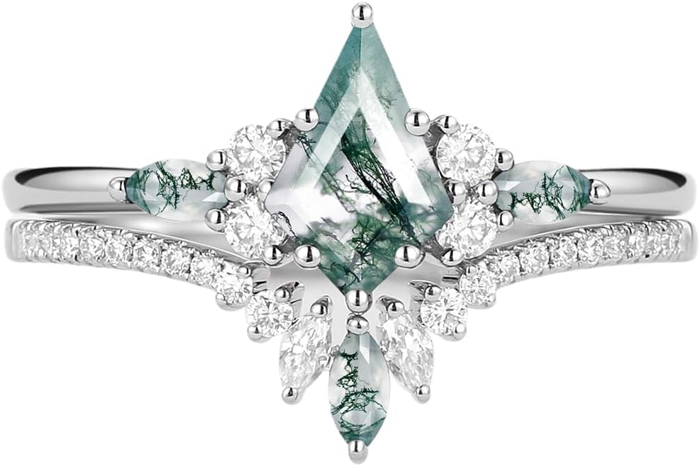 1.5 Carat Moss Agate Wedding Ring Set for Women - Kite Cut Moss Agate Bridal Sets Wedding Rings White Yellow Rose 10K 14K 18K Gold Vintage Promise Anniversary Ring Set