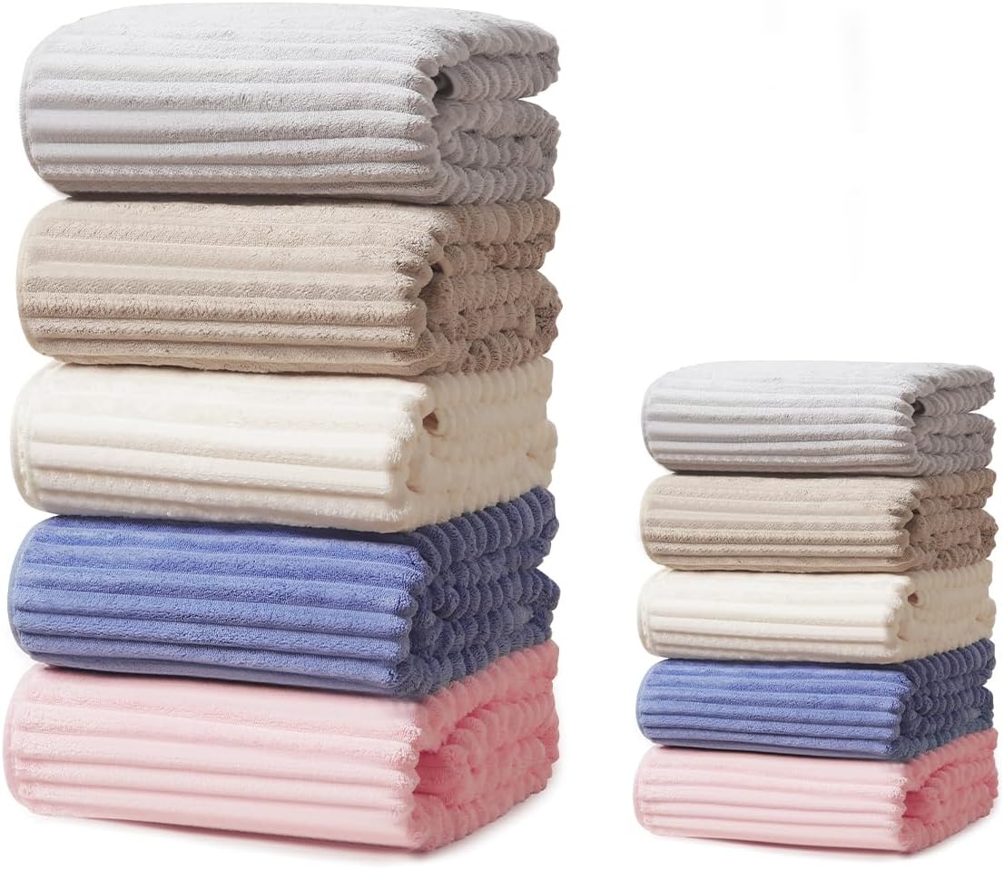 - 【Dual Sizes for All Needs】5 large bath towels (60×40in) for full-body drying, plus 5 small towels (30×13in) for quick hand/face use—ideal for every daily scenario.