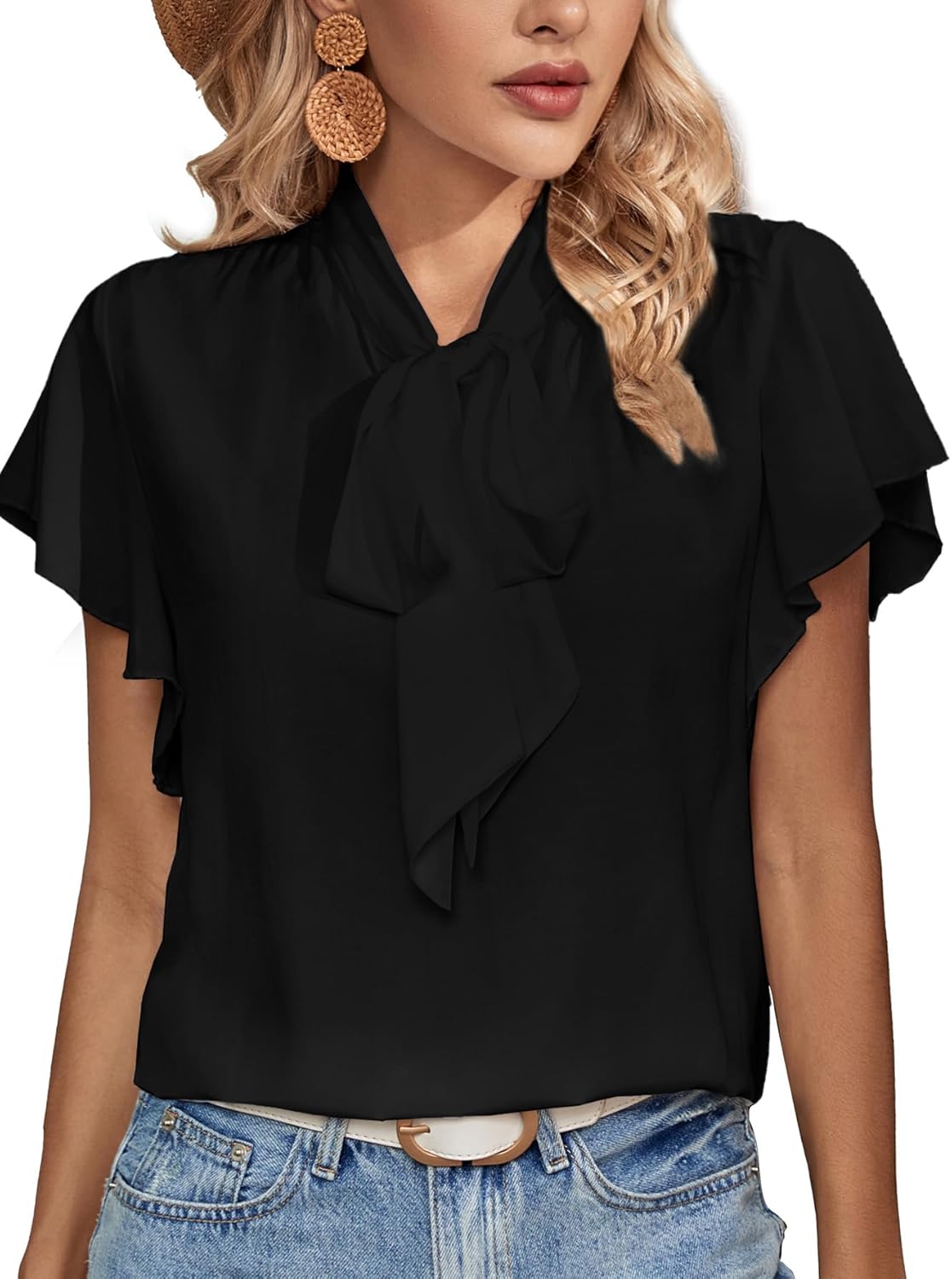 Rooscier Women's Bow Tie Neck Ruffle Short Sleeve Vintage Retro Work Blouse Top