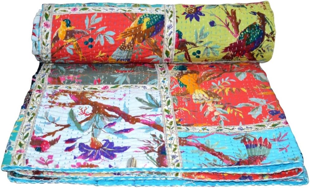 Bird Print Patchwork Cotton Kantha Quilt Throw Blanket Bedspread Gudari (Twin Size)