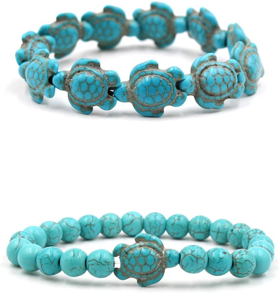 Soyzvteo 2Pcs Sea Turtles Beads Bracelet Elastic Natural Stone Stretch Bracelet Turquoise Turtle Bracelets Friendship Gifts for Women Men Girls
