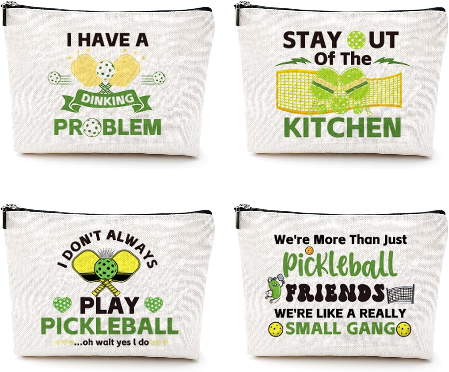 - Diverse Theme: You will receive 4 different styles of DINKLEBALL-themed cosmetic bags.One bag proudly proclaims “We're More Than Just Pickleball FRIENDS WE'RE LIKE A REALLY SMALL GANG,” celebrating the close - knit community of pickleball lovers. Another bag humorously states “I HAVE A DINKING PROBLEM,” a nod to the popular pickleball shot. The “STAY OUT Of The KITCHEN” bag is a playful reference to the no - volley zone in pickleball, while the “I DON'T ALWAYS PLAY PICKLEBALL...oh wait yes I do” bag showcases your unwavering passion for the sport.