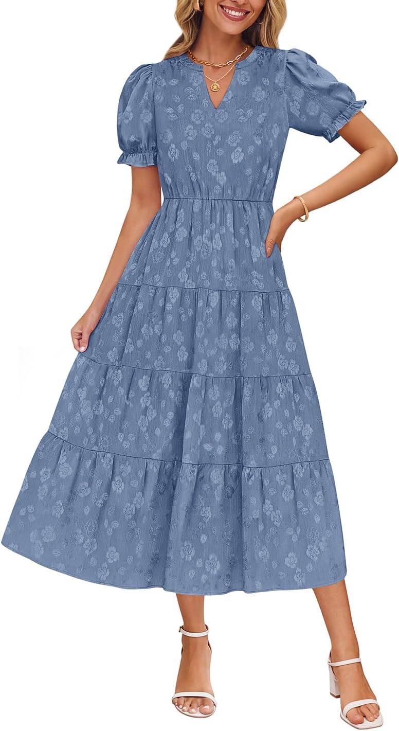ZESICA Womens 2026 Summer Puff Short Sleeve Midi Dress Floral V Neck Textured Ruffle Flowy Beach Party Dresses