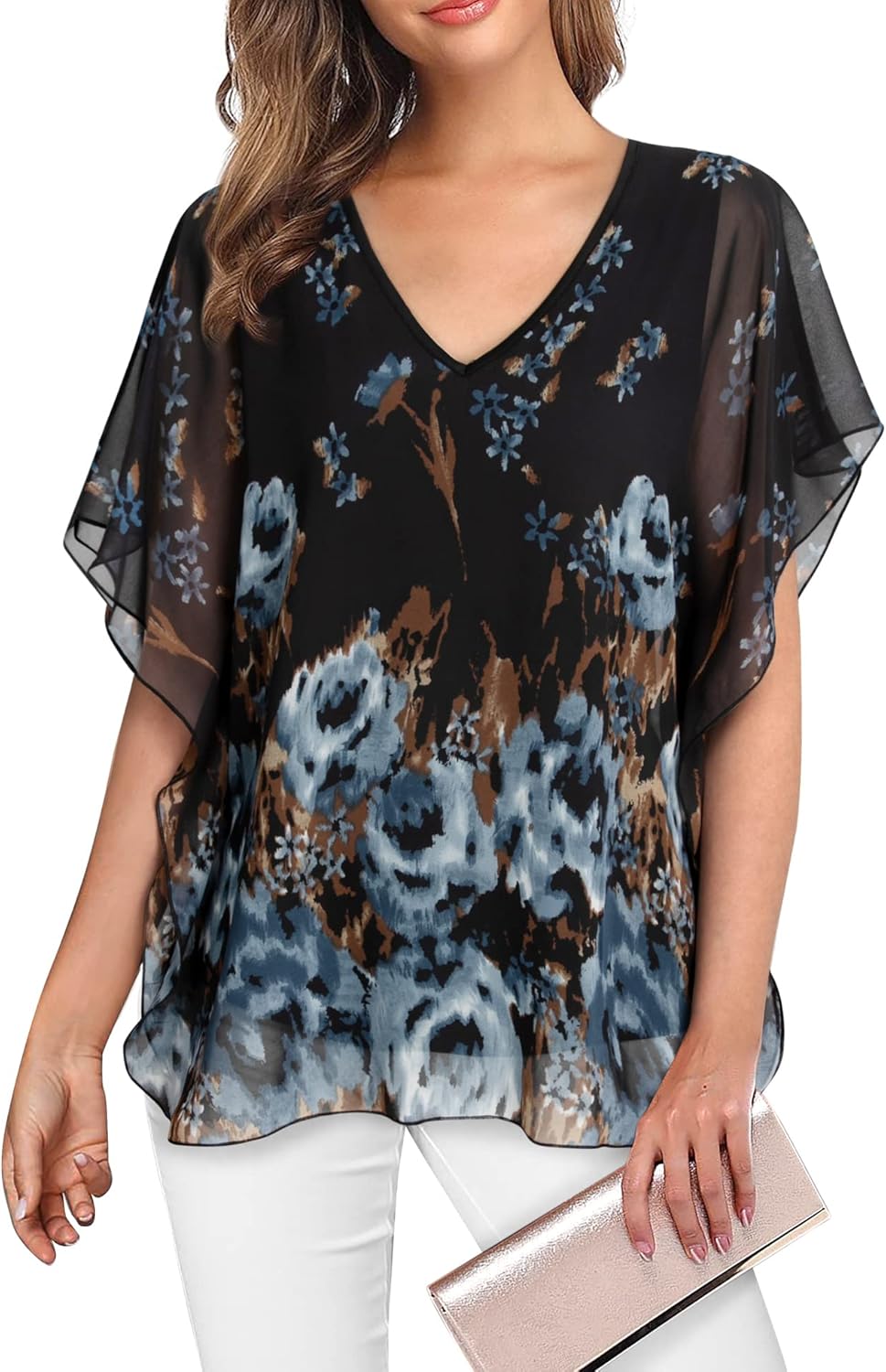 Lotusmile Women's Loose Flouncing Flutter Sleeve Double-Layered Shirt Chiffon Elegant Dressy Blouse Work Tops