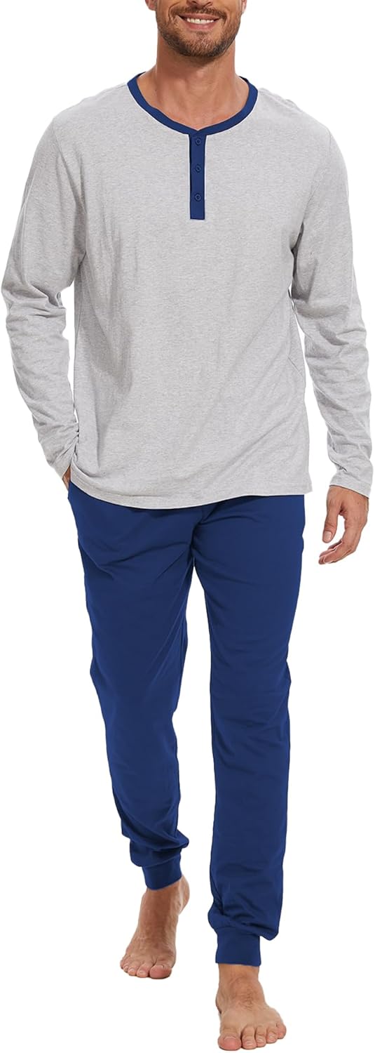 Men's Pajama Set with Henley Neckline 100% Cotton Soft and Comfortable Nightwear 2-Piece Lounge Set