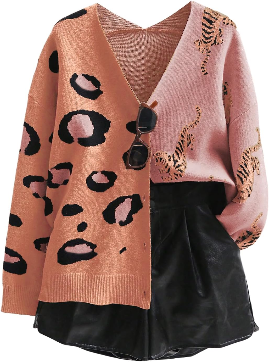 WDIRARA Women's Leopard Tiger Print Cardigan V Neck Long Sleeve Color Block Button Down Sweater Outwear