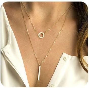 Bar Pendant Necklace Gold Bar Circle Strip Layered Necklace 14K Gold Plated Delicate Pendant, Layered Y Necklace for Women and Teen Girls