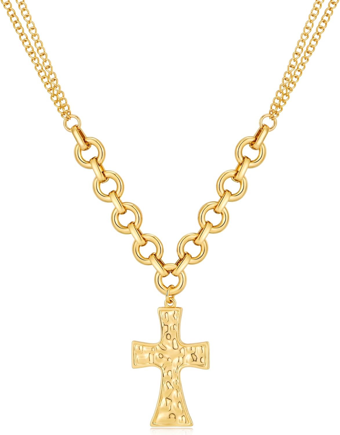 Chunky Cross Necklace for Women Gold Plated Big Cross Pendant Hammered Thick Chain Necklace Statement Faith Jewelry