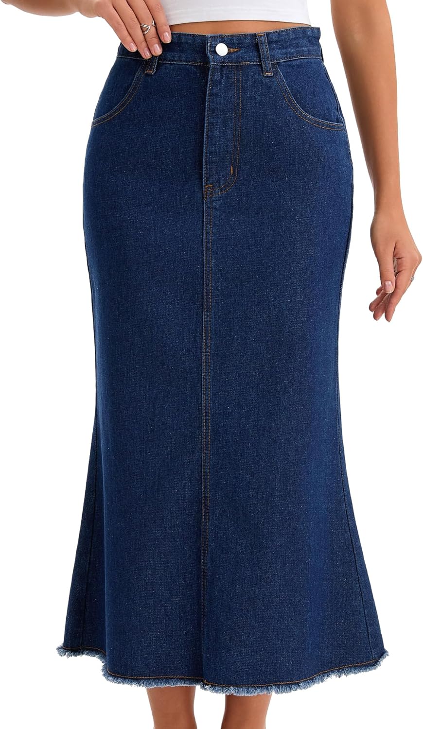 Women Denim Skirt Maxi A Line High Waisted Raw Hem Casual Jean Skirt