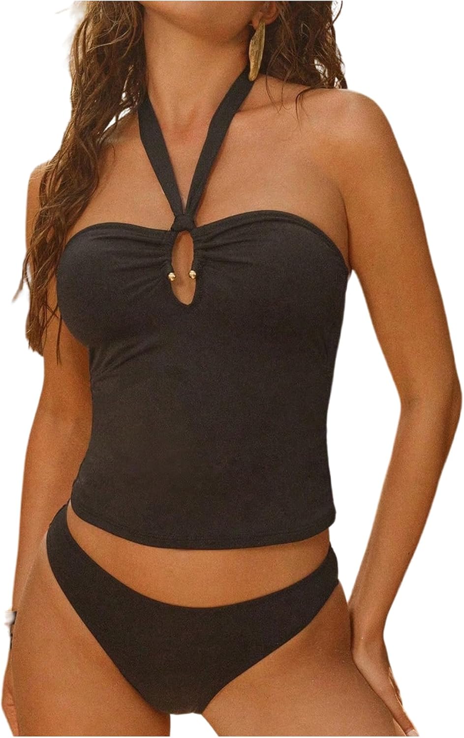 MakeMeChic Women's Tankini Swimsuits Halter Tie Back Tummy Control Swimwear Bathing Suit