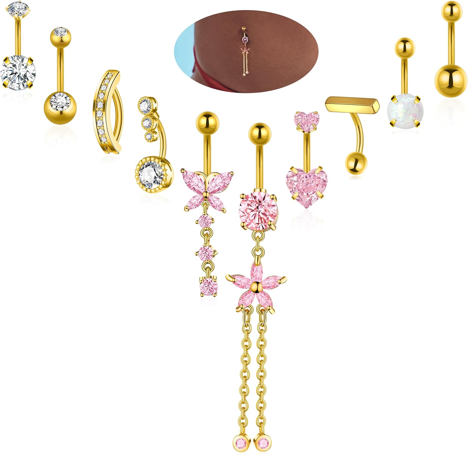 Gold Silver Belly Button Ring Belly Rings for Women Belly Button Piercing 14G Surgical Stainless Steel Dangle Flower Pink Heart Opal Navel Belly Piercing Jewelry Clicker Belly Button Jewelry