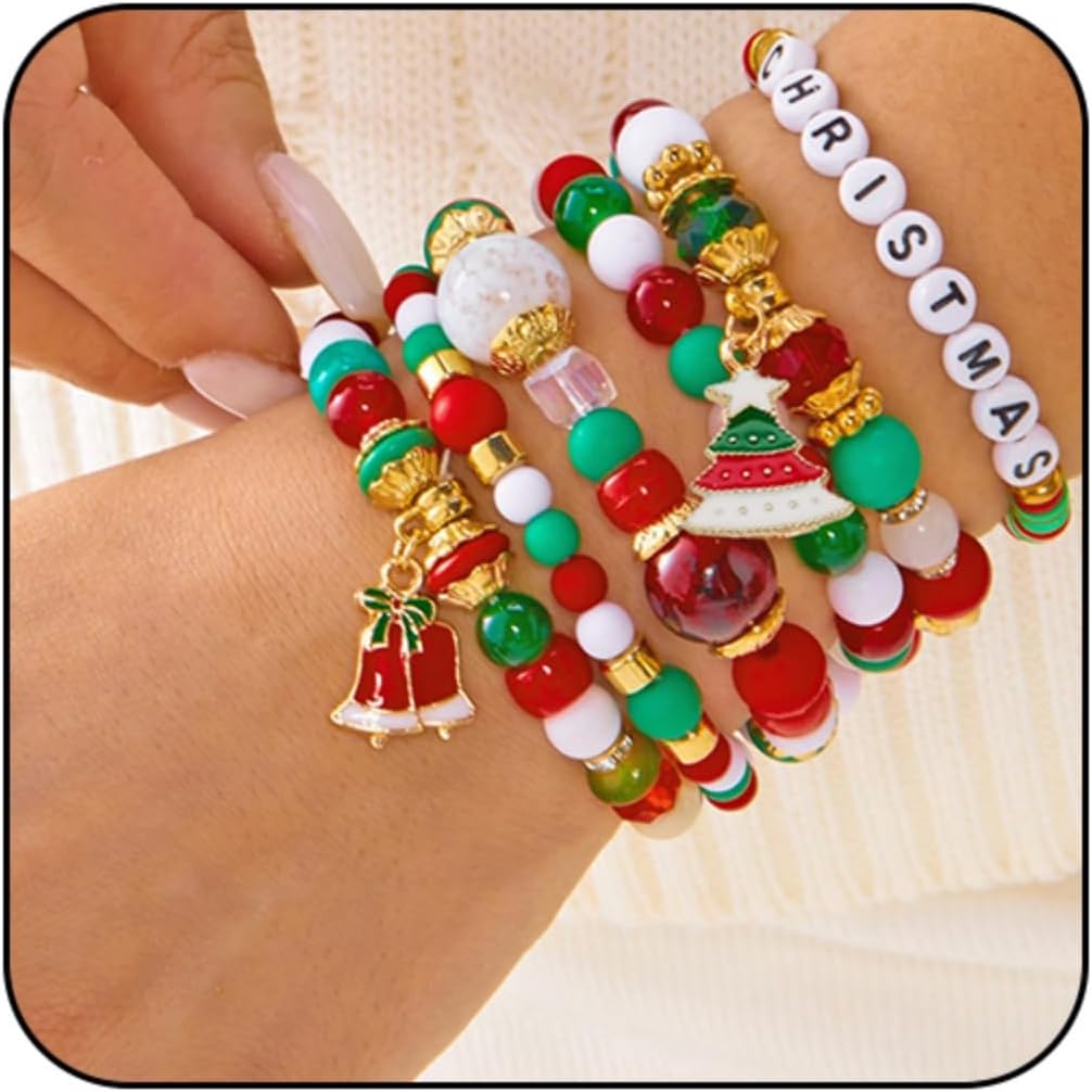 WCRAZYE Christmas Bracelets for Women Red Green Snowflake Santa Claus Christmas Tree Festive Beaded Bracelets Stackable Stretch Friendship Bracelets