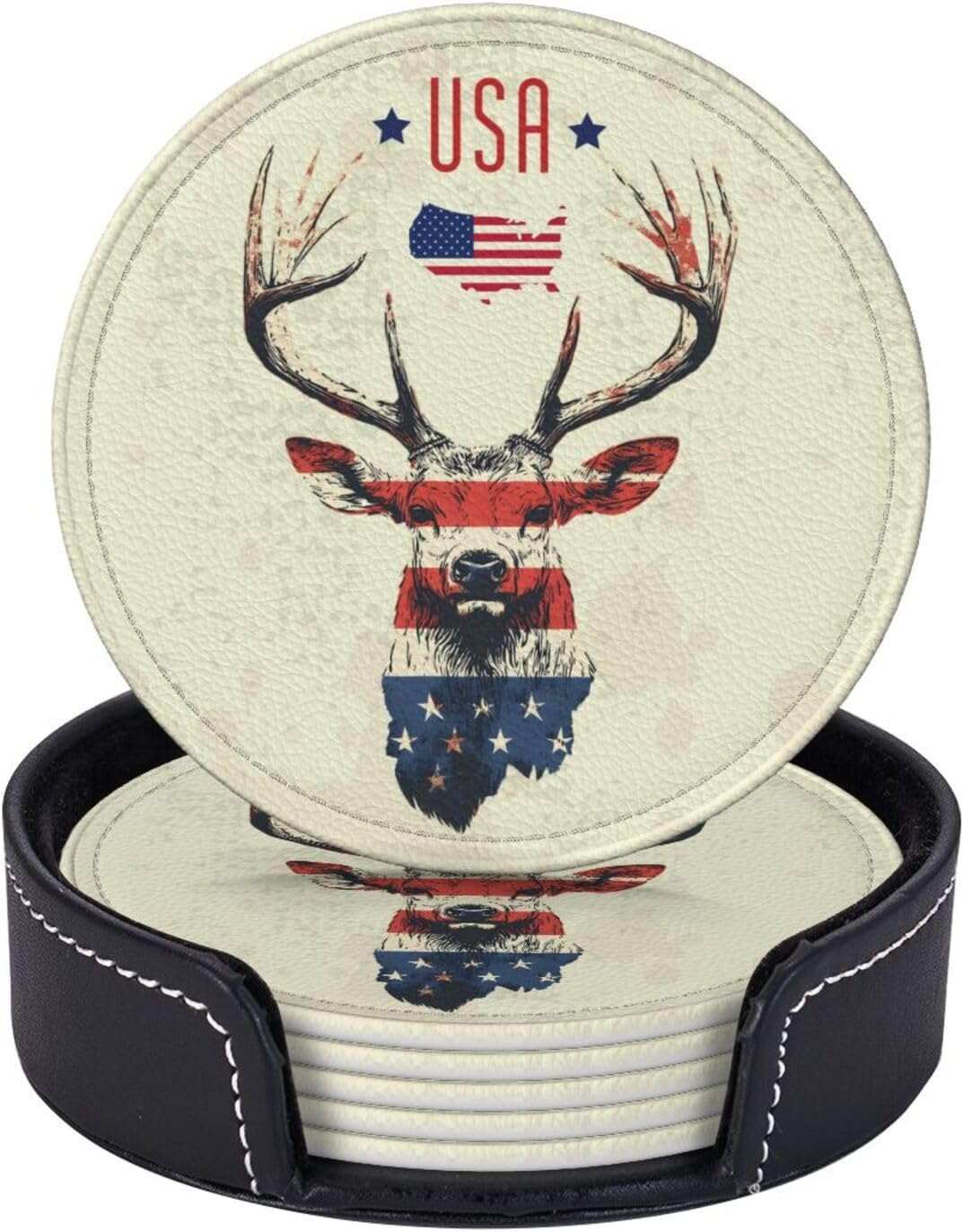 American Flag Leather Coasters Set of 6 Round Vintage Coasters with Holder for Home Office Vintage USA Deer