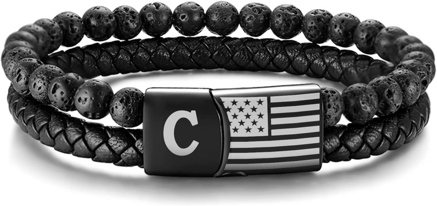 Leather Initial Bracelet for Men Gifts : Mens American Flag Black Lava Rock Braided Cord Letter Wristband for Valentines Birthday Christmas Male Jewelry Gift for Him Husband Dad Son Boyfriend