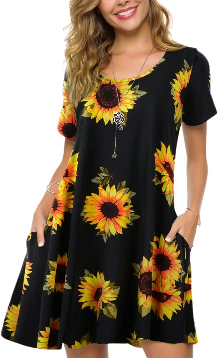 ZENNILO Plus Size Casual T Shirt Dresses for Women Flowy Sunflower Dress Pockets(A-SunFlower27,1X)