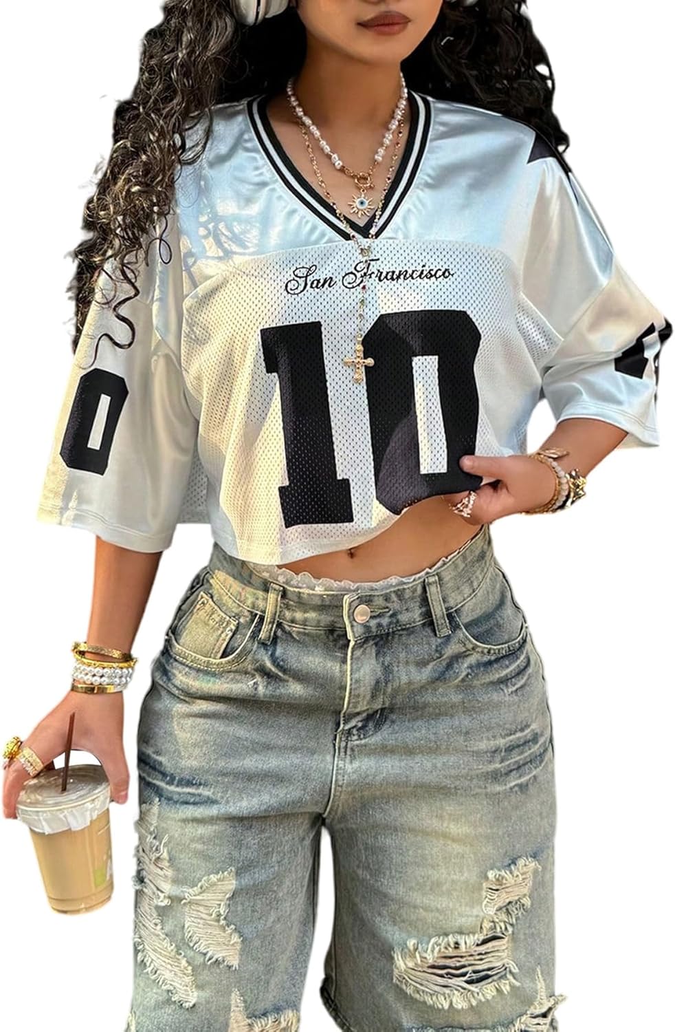 SweatyRocks Women's Number Graphic Jersey Shirts Y2k Crop Jerseys V Neck Oversized Baggy Tops Streetwear