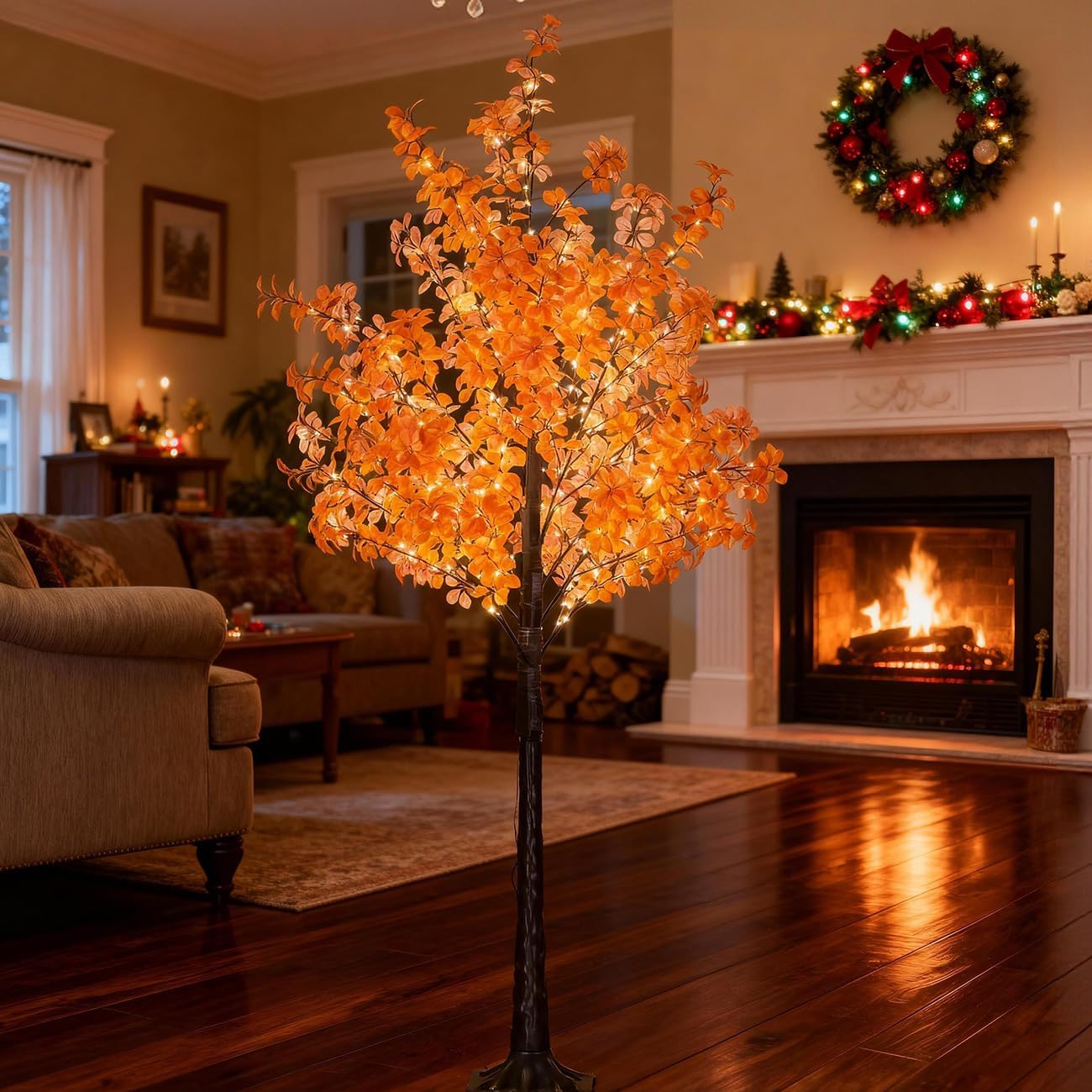6FT 5-Leaf Lucky Tree Christmas Tree with Warm White Lights - 300 LEDs Weatherproof Indoor/Outdoor Lighted Maple Tree, 16ft Extension Cord & Stakes, 4 Dimming Modes + Timer (Yellow&Red)