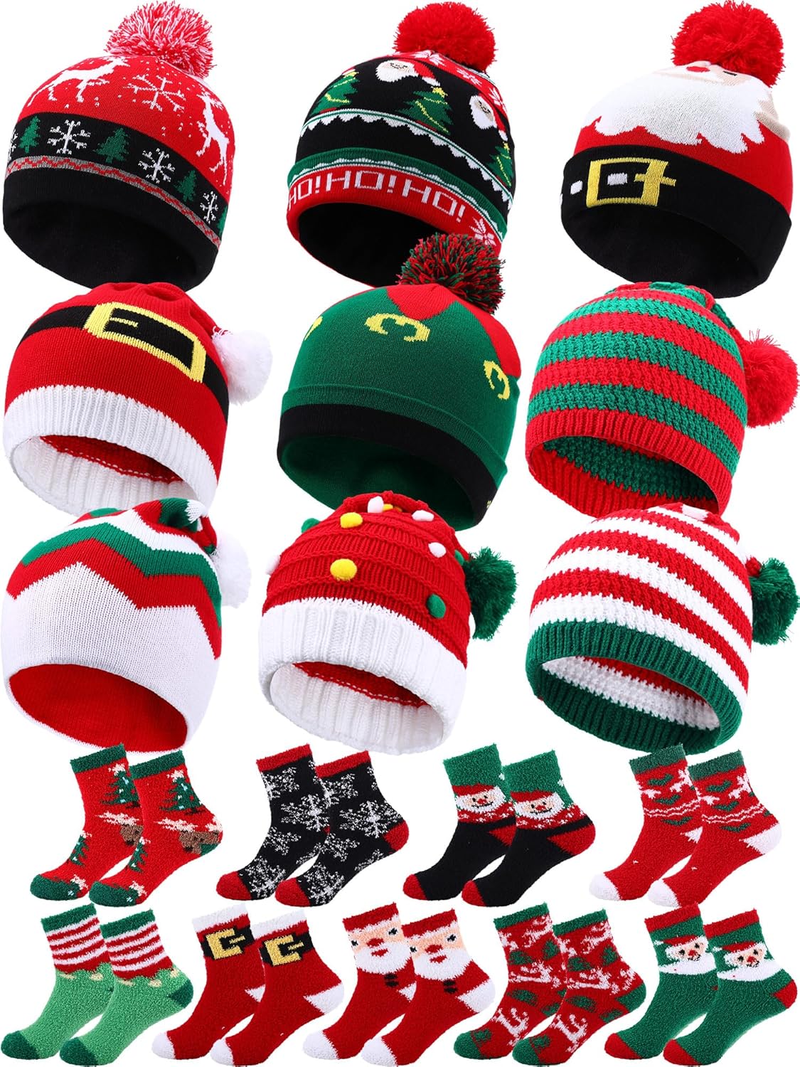 Suhine 18 Pcs Christmas Knitted Hat and Socks Set 9 pcs Christmas Beanies Hat with Pompom 9 Pair Xmas Socks for Men Women