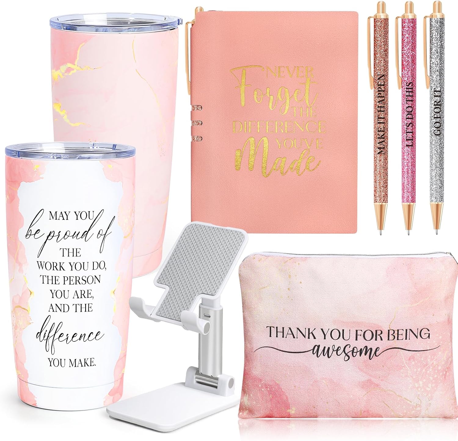 - BEST EMPLOYEE APPRECIATION GIFTS: Suhctuptx exclusive thank you gifts will be your best choice to use to thank your employees, 8pcs appreciation gift box including a 20oz tumbler, large-capacity cosmetic bag, a5 leather notebook, 3 ballpoint pens, cell phone stand, greeting card, and a beautiful gift box - every use becomes a joyful reminder of the impact they've had through their dedication or kind gestures. Give the gift that keeps giving, capturing your appreciation in every delightful detail.