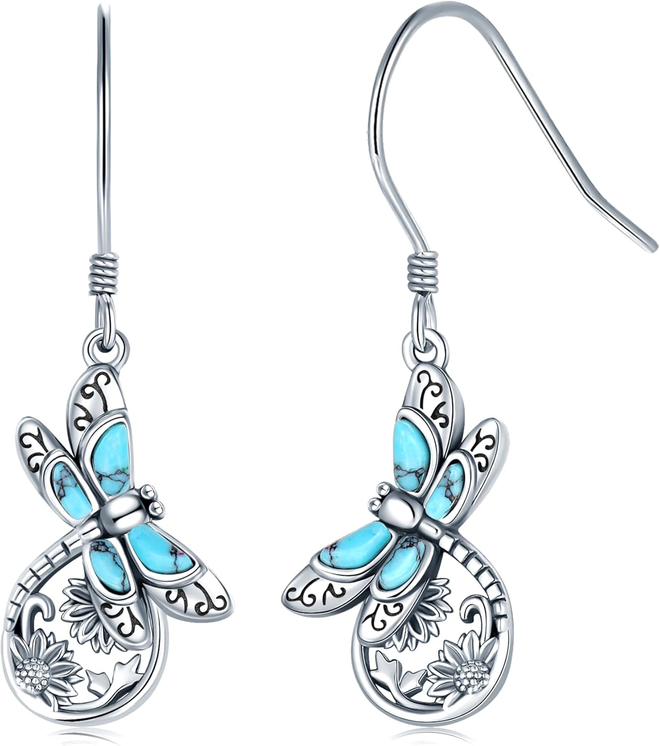 S925 Sterling Silver Turquoise Dragonfly Sunflower/Hummingbird/Butterfly/Cross/Anchor Earring Vintage Bohemian Jewelry Natural Drop/Stud Earrings Birthday Jewelry Gifts for Women