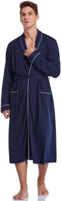 CF Men's 100% Cotton Robe Lightweight Bathrobe Long Sleeve Knit Kimono Sleepwear Soft Knee Length Shower Robe with Pockets