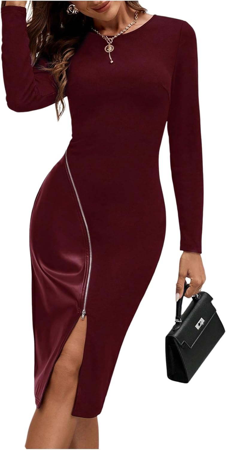 SOLY HUX Women's Patchwork Leather Zipper Dress Crew Neck Long Sleeve Split Hem Elegant Bodycon Dress