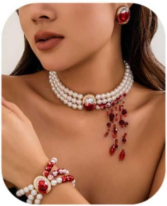 3Pcs Handmade Dripping Blood Imitation Pearls Necklace Earrings.bracelet Vampire Choker Party Costume Women