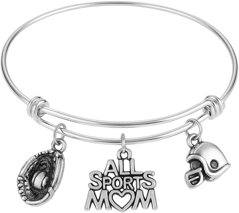 All Sports Mom Silver Plated Bracelet Adjustable Bangle with Football Helmet and Baseball Glove Charms Gift for Athletic Moms Coaches and Sports Families