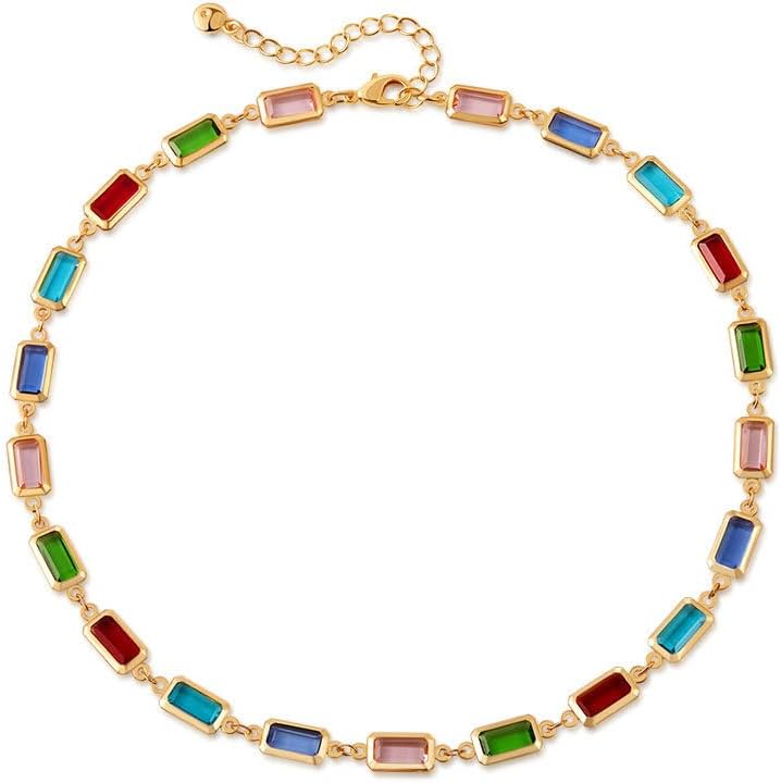 Dainty Rectangular Colorful Rhinestones Glass Chain Necklace for Women Gold Minimalist Geometric Multicolor Rainbow Diamond Beaded Adjustable Choker Summer Boho Trendy Jewelry for Her