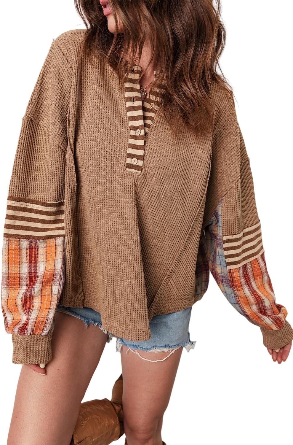 Maketina Womens Stripe Plaid Patchwork Waffle Knit Tops Casual Henley Neck Colorblock Long Sleeve Shirts