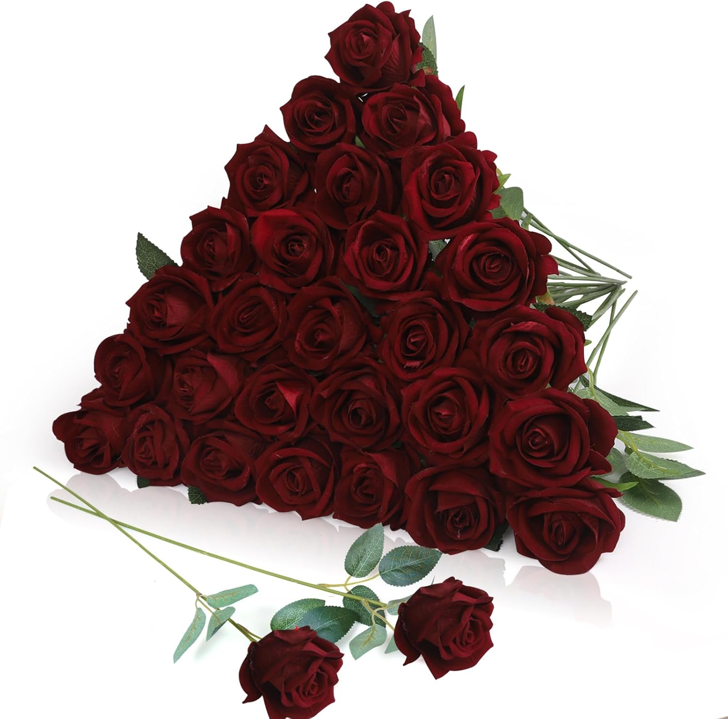 30pcs Fake Roses Artificial Silk Flowers Long Stems Bouquet for Wedding Bridal Shower Party Home Decoration (Wine Red)