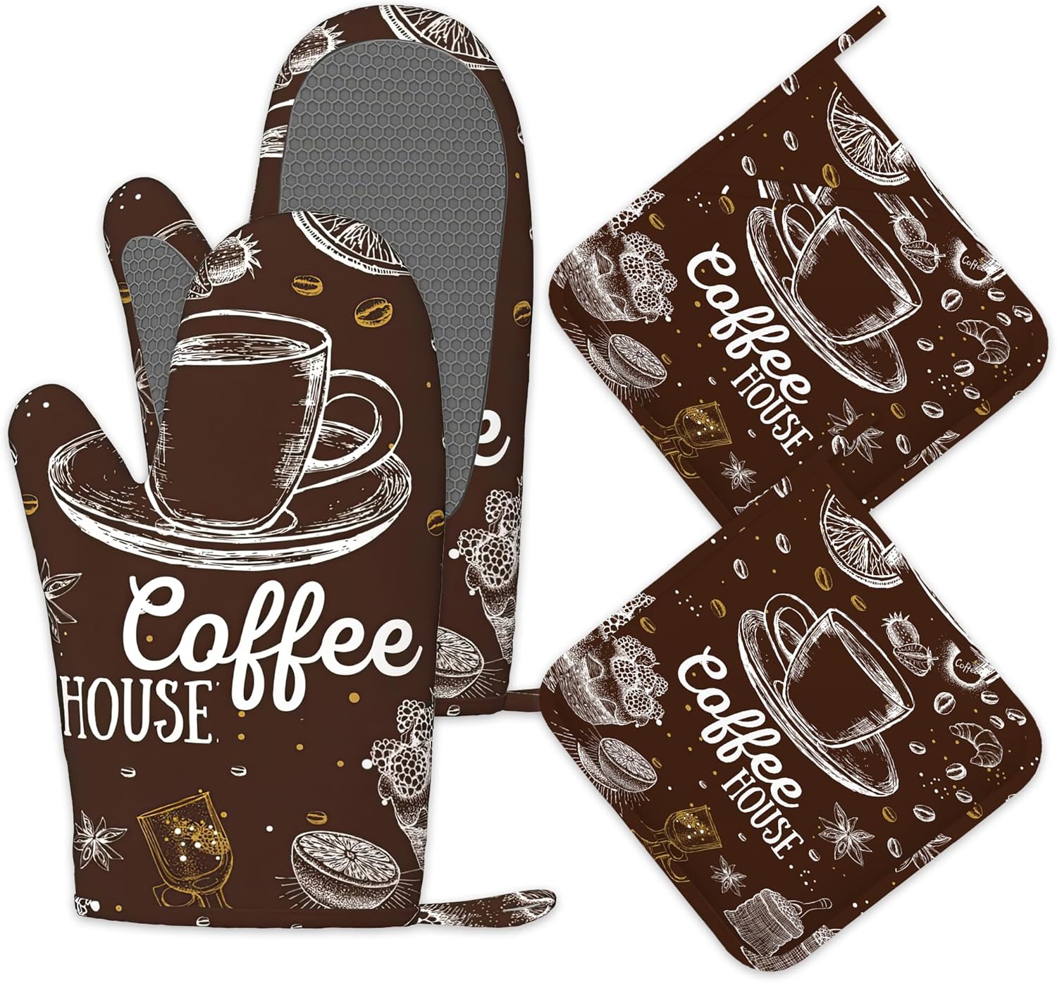 Coffee House Oven Mitts and Pot Holders Sets,Silicone Kitchen Mitts Potholders Heat Resistant 4Pcs Oven Gloves Hot Pads for Kitchen Baking Cooking
