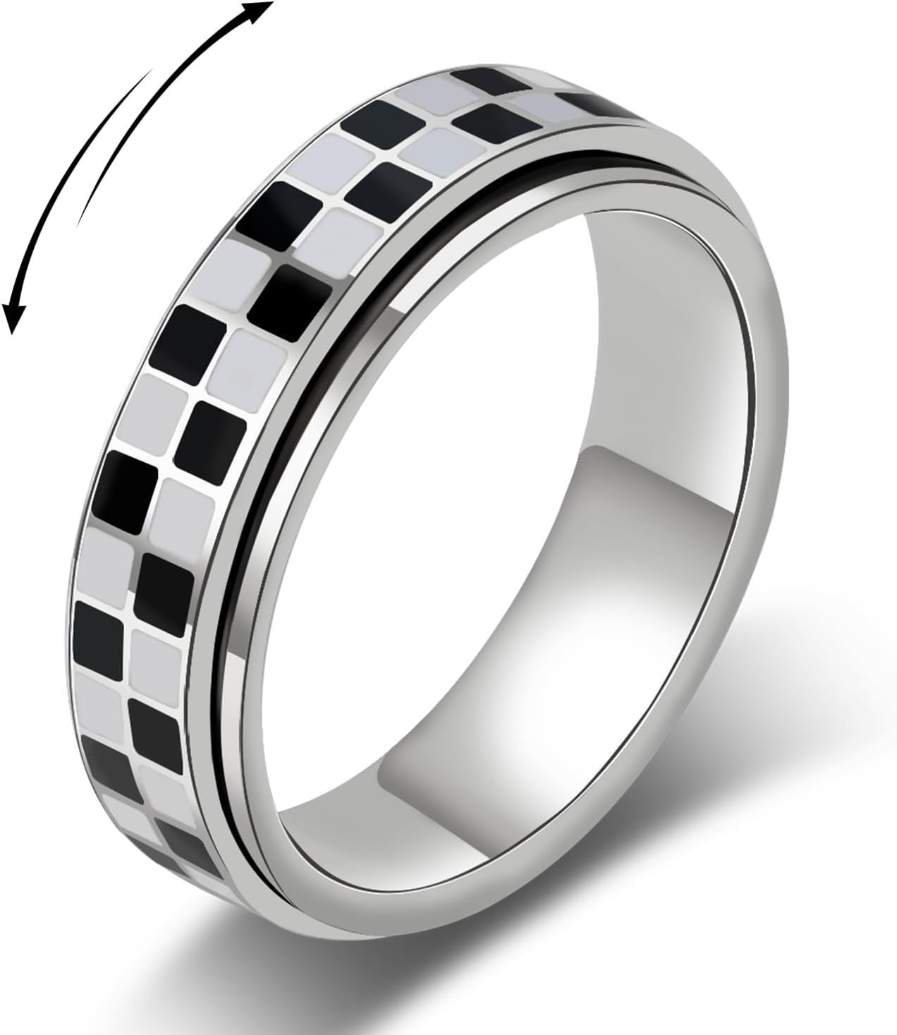 AmorArtSky Checkered Fidget Ring for Adults - 18K Gold Plated Stainless Steel Rotating Spinner Jewelry, Anxiety & Stress Relief Gift for Women/Men (Black and White Pattern)