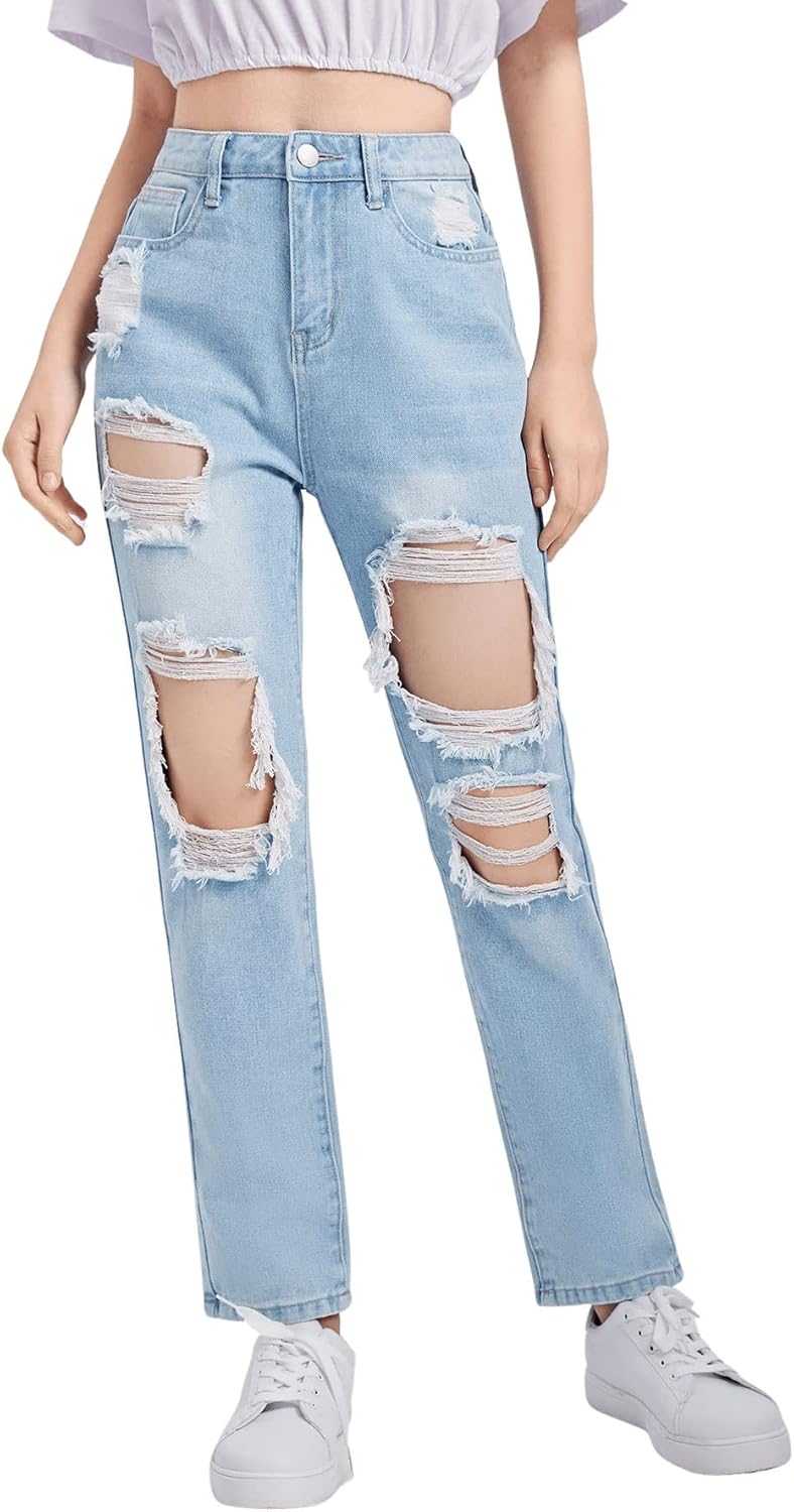 SweatyRocks Teen Girl's High Waisted Straight Leg Ripped Jeans Washed Denim Pants with Pockets