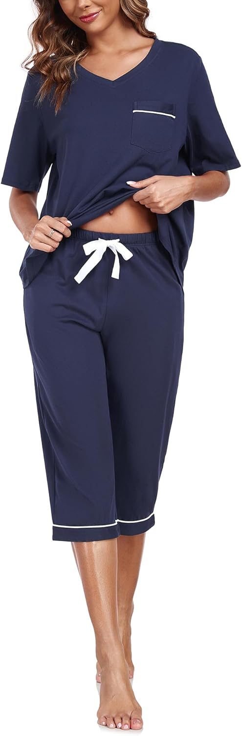 COLORFULLEAF Womens Pajama Sets 100% Cotton Summer Pj Set Capri Pants Sleepwear 2 Piece Lounge Set with Pockets