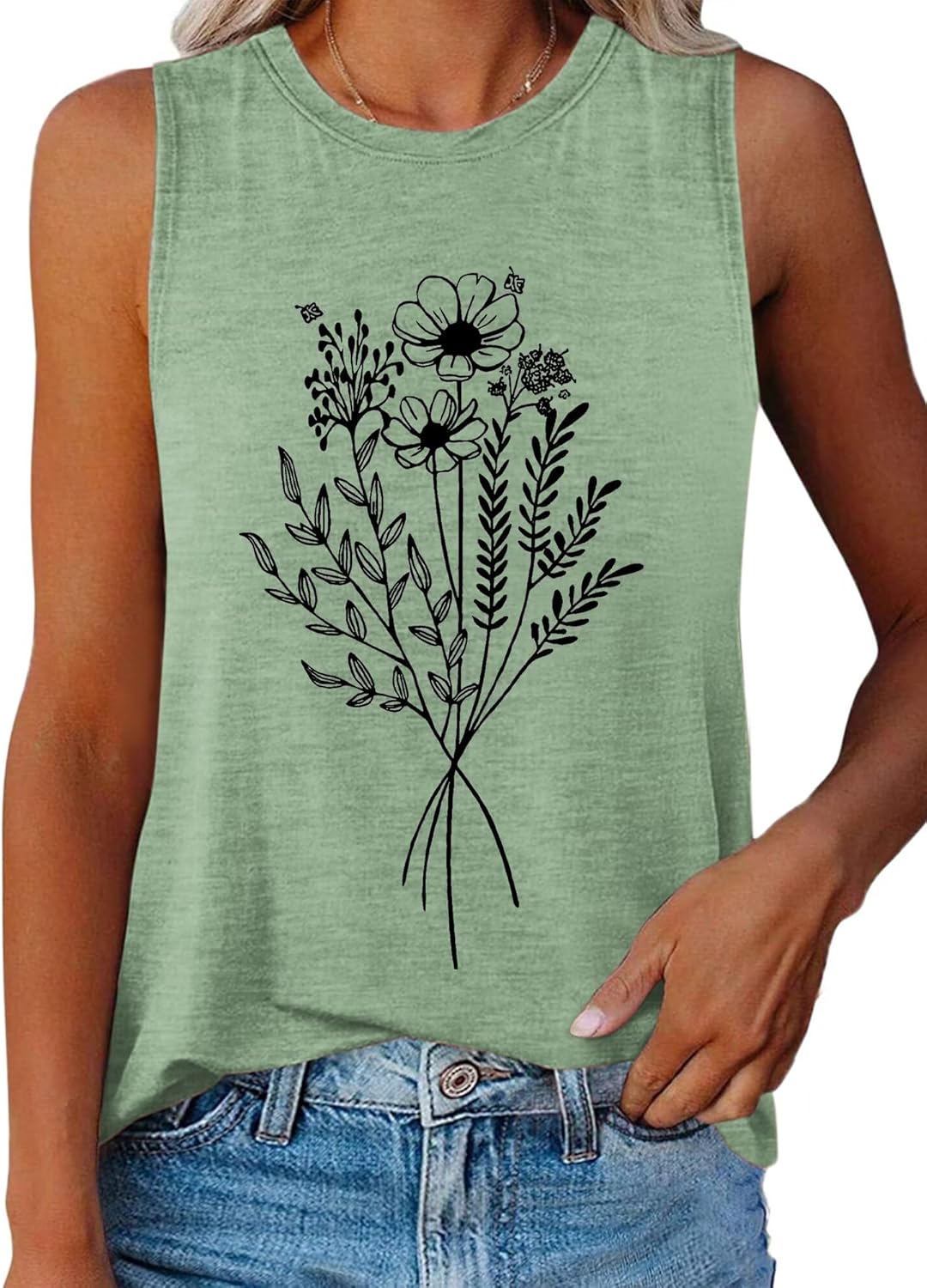 ORANDESIGNE Womens Flower Print Crewneck Tank Tops Graphic Curved Hem Sleeveless Tops Summer Casual Loose Fit Shirts