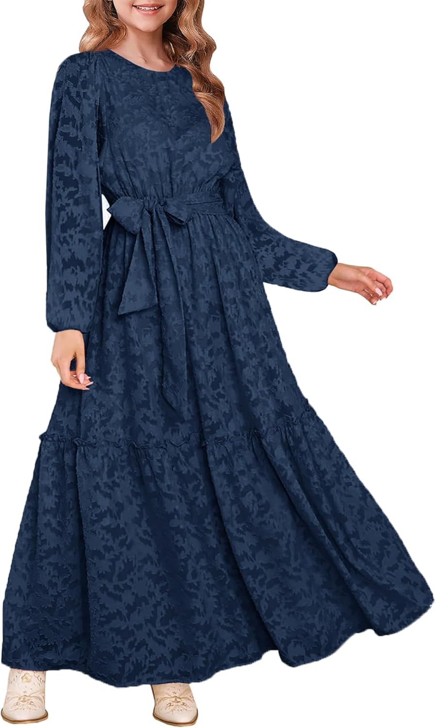MITILLY Girls Long Sleeve Dress Elegant Floral Crew Neck Elastic Waist Formal Maxi Dresses with Belt 6-12 Years