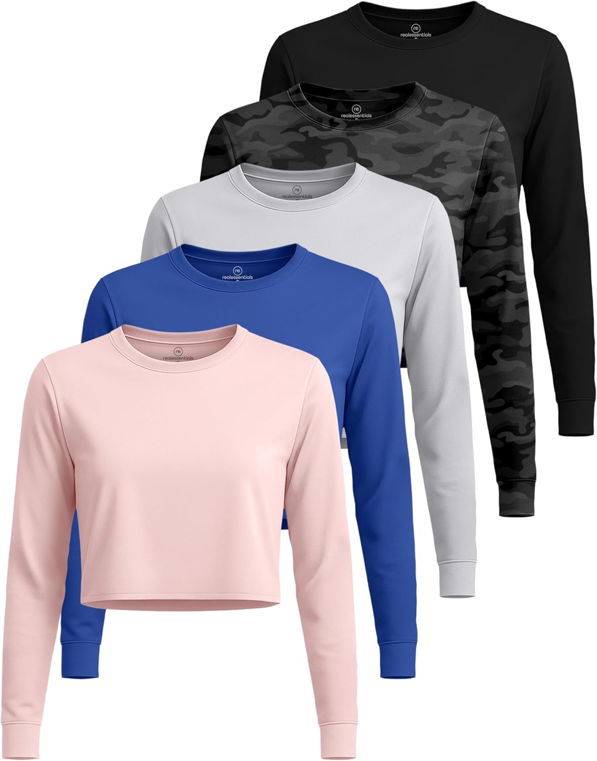 Real Essentials 5 Pack: Women's Dry-Fit Long Sleeve Crop Top - Running Workout Gym Athletic Crew Neck Shirt (Plus Available)