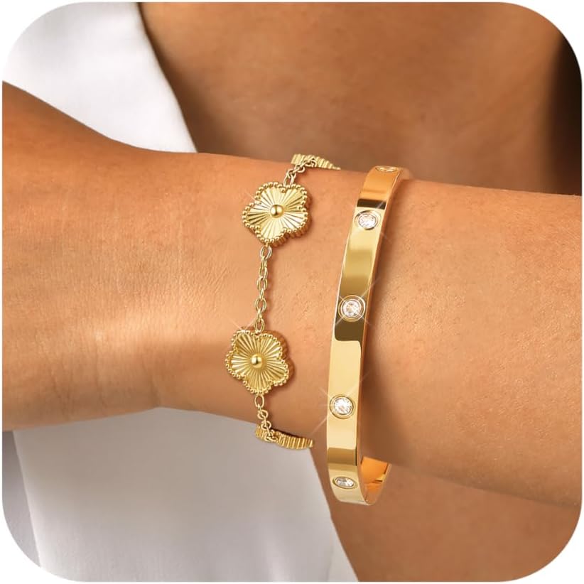 MPRAINBOW Womens Stackable Gold Bracelets Jewelry, 18K Gold Plated Floral Bracelet,Bangles Non Tarnish, Gold Cubic Zirconia Chain Set Trendy Gift,Christmas Valentines Birthday Gifts for Girlfriend