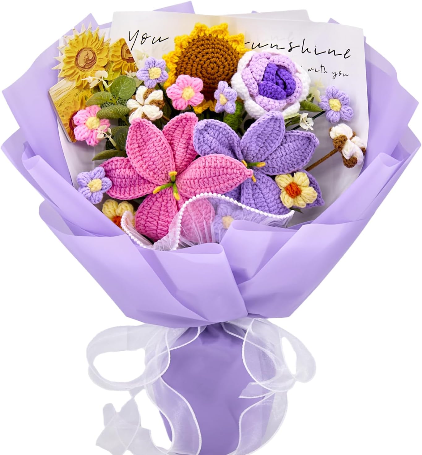 YSHomy Crochet Flowers, Crochet Flower Bouquet with 14 Crochet Flowers of Sunflower, Roses, Purple Lily Bouquet,Gifts for Birthday,Graduation,Thanksgiving,Get Well,Valentine's Day(Include Card)