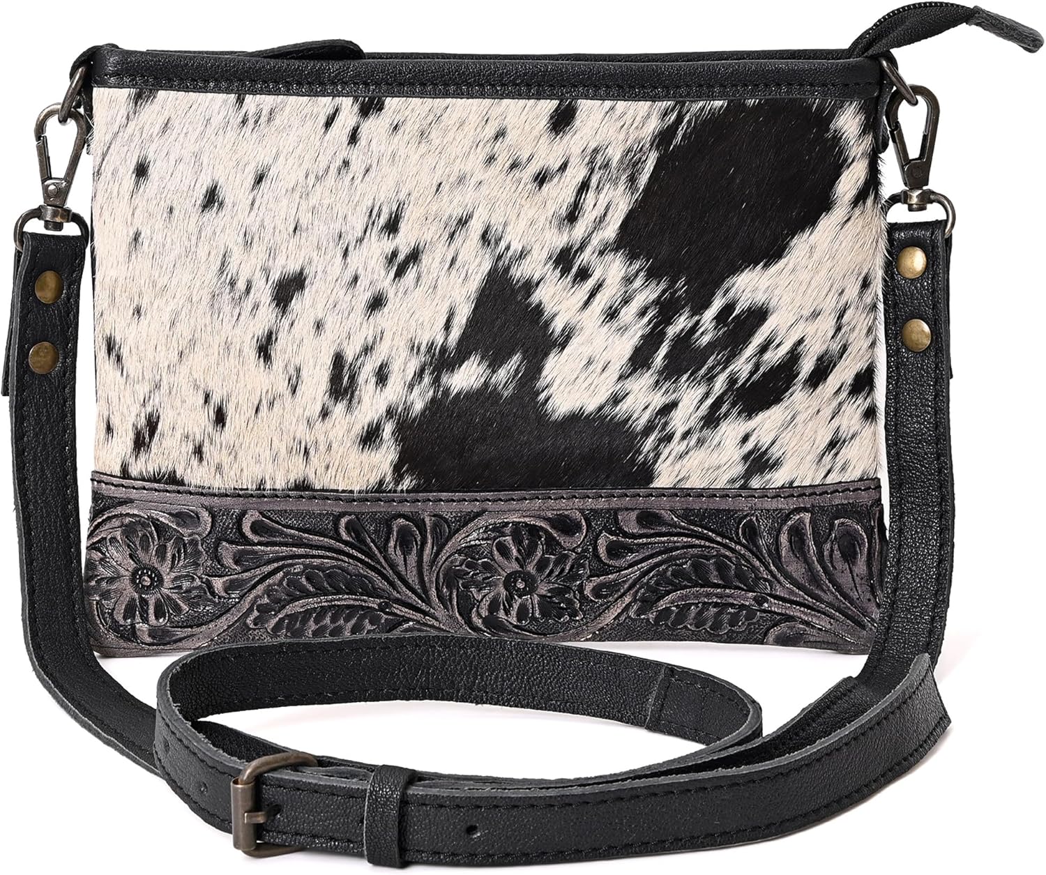 Merbaa Western Cowhide Tooled Leather Small Crossbody Bag Cowgirl Fashion Purse with Adjustable Detachable Shoulder Strap