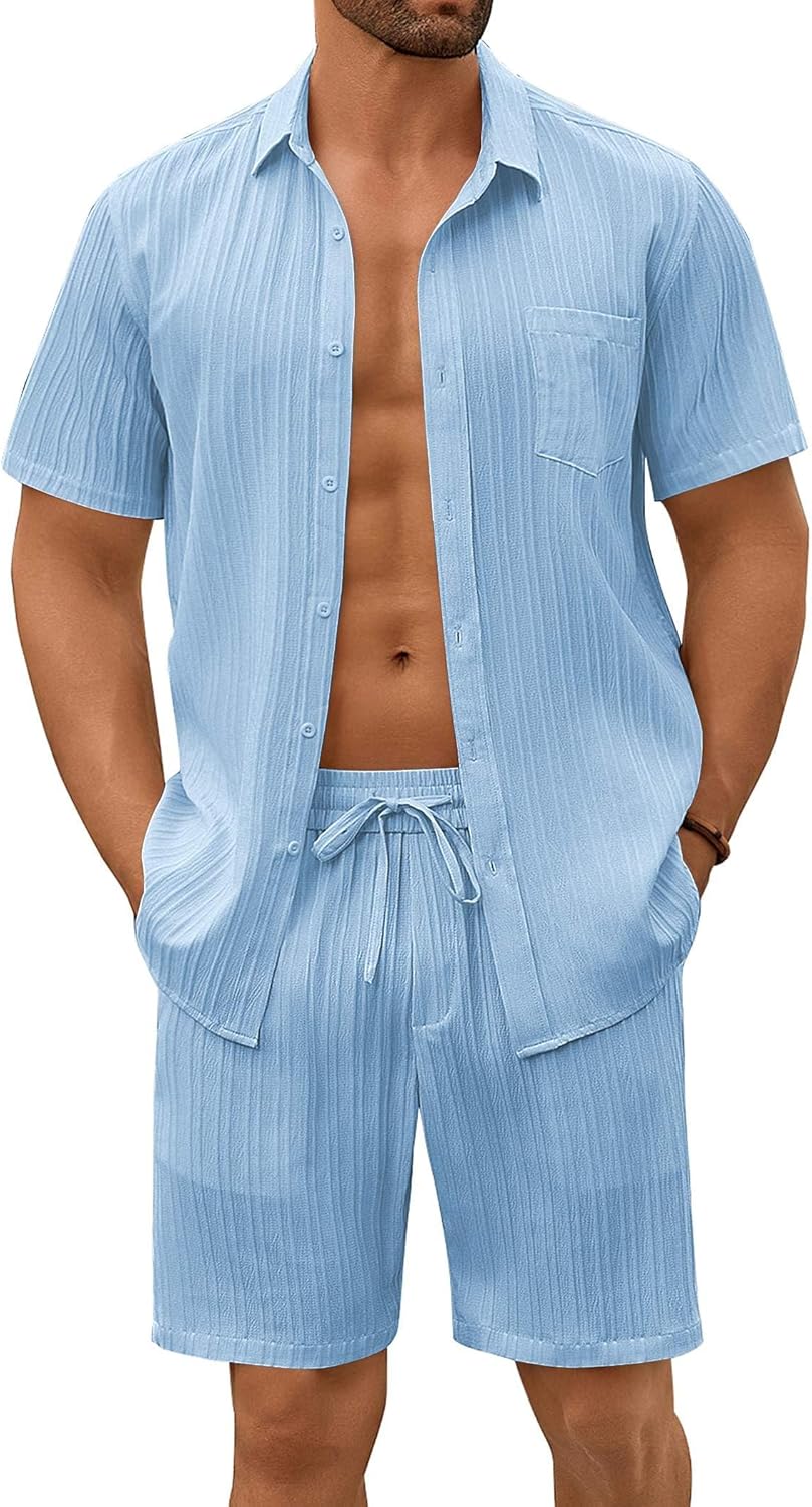 COOFANDY Mens Beach Outfits 2 Piece Sets Casual Short Sleeve Button Down Summer Textured Shirt