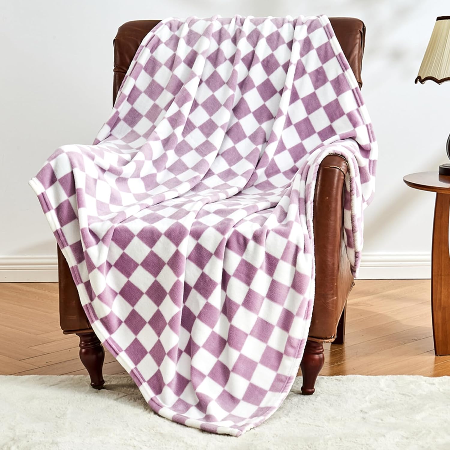 Checkered Blanket Flannel Throw Blankets Soft Cozy Checkered Grid Print Chessboard Gingham Pattern Throws for Bed Sofa Couch for All Seasons, 50x60 Inch, Purple